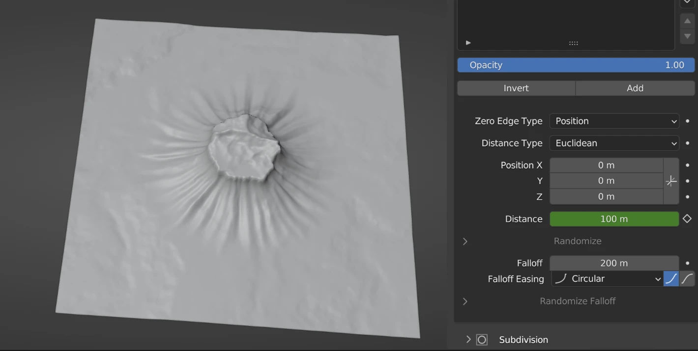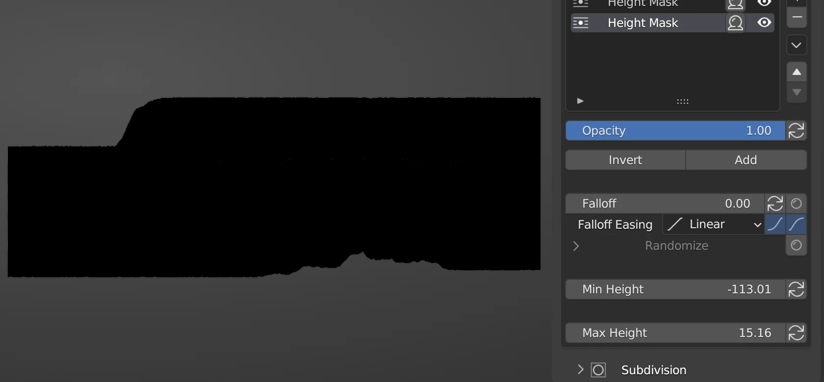 This mask aids in establishing concealed boundaries between layers. It sets the height of the relevant layer to 0 at the edge of the combined Distance and Falloff settings.