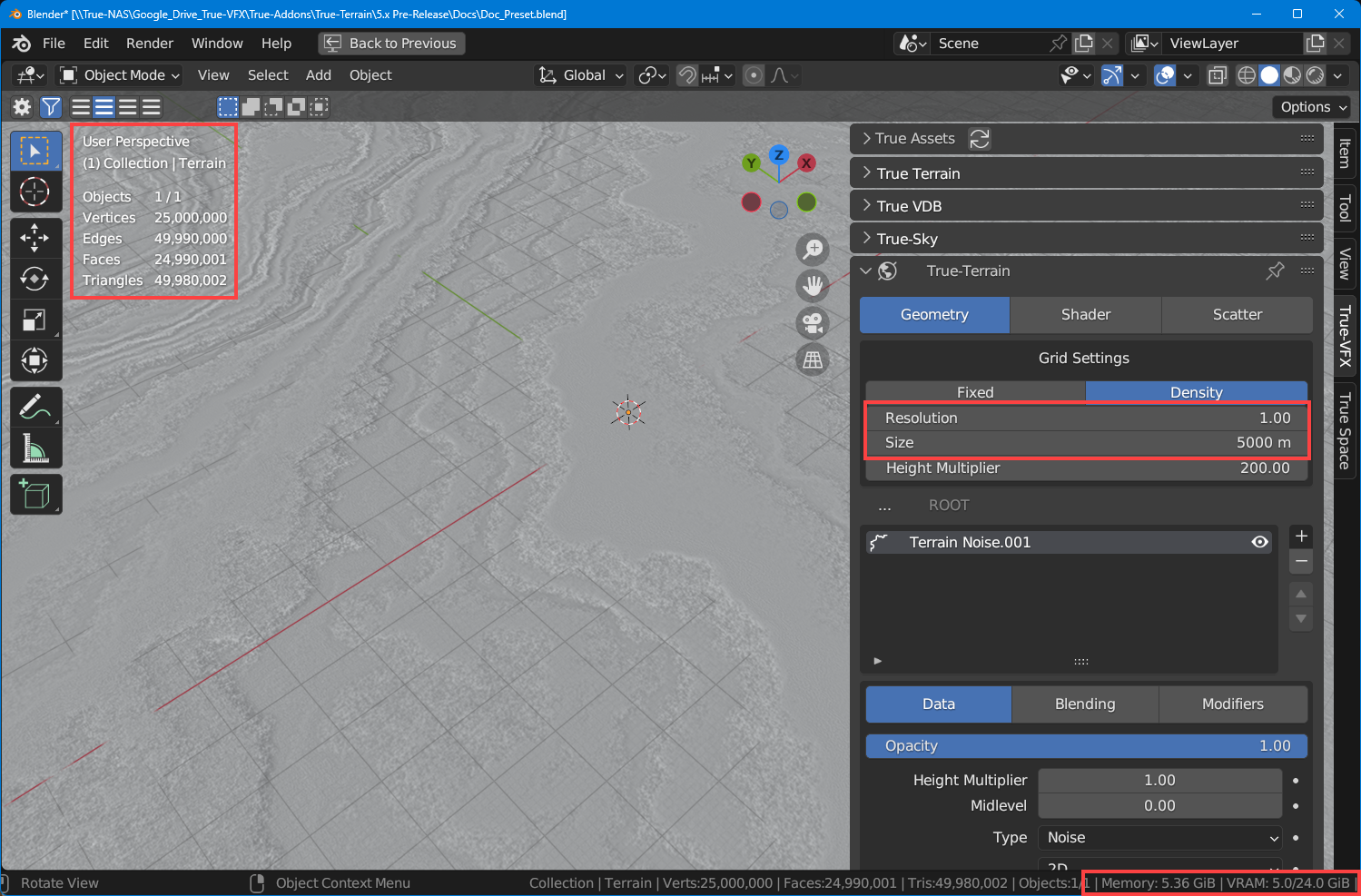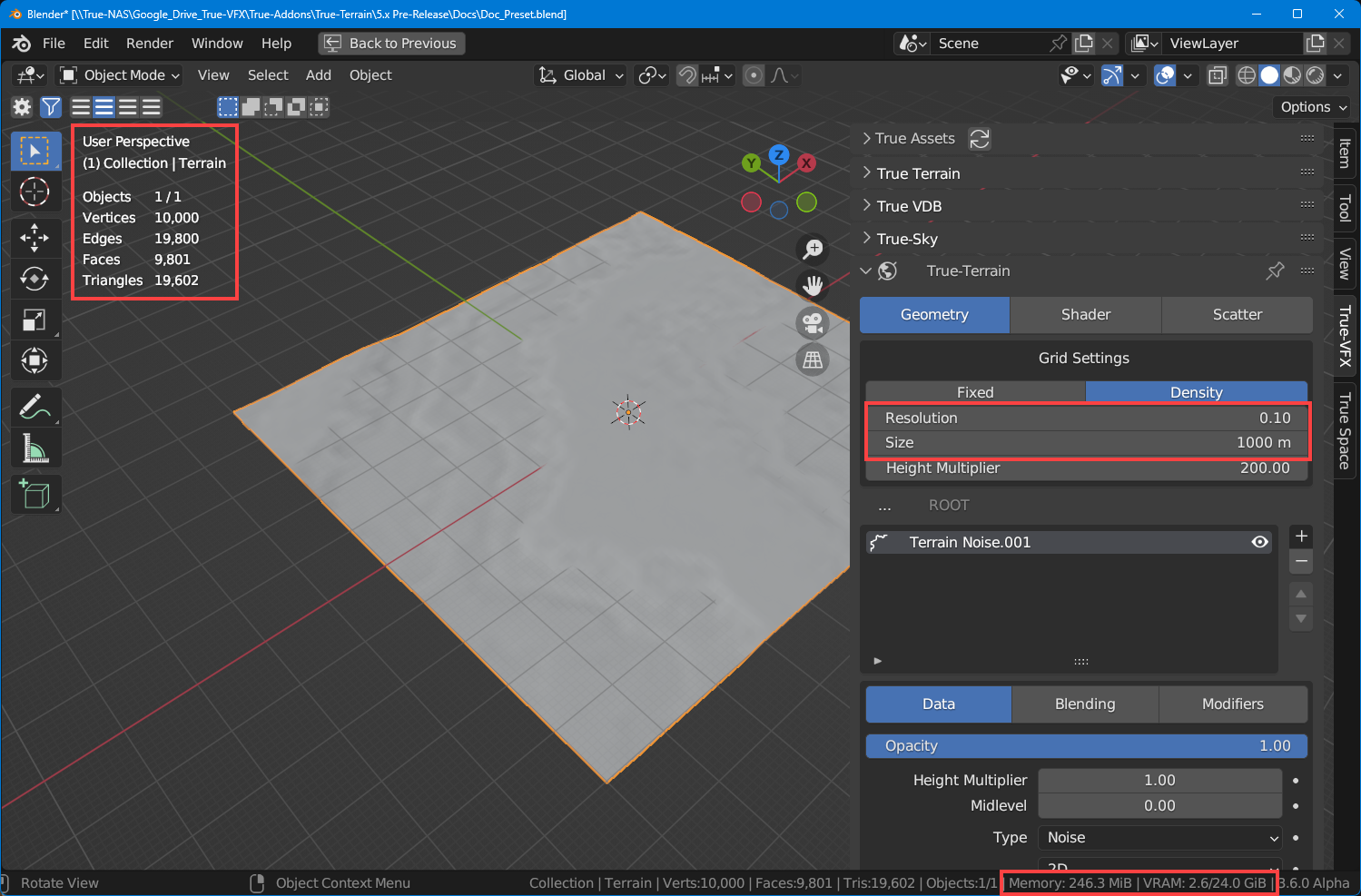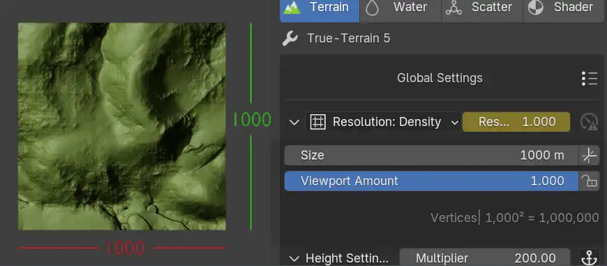 When utilizing the Density feature, the size of the object affects its functionality. By default, the value is 0.10 since the default size is 1km. This signifies that the mesh's resolution is one-tenth of the size, resulting in 10,000 vertices. If you increase the resolution to 1 with a size of 1000m, you will have 1 million vertices (1000x1000(x,y)). It is IMPORTANT to bear this in mind as this can result in significantly more computer resources being used with larger meshes.