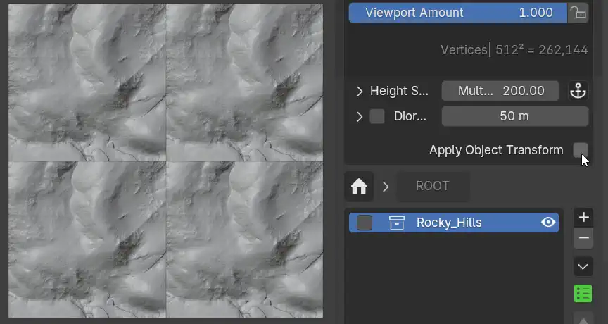 A terrain duplicated 4 times and lined up next to itself with and without Apply Object Transform enabled.