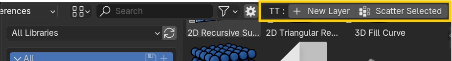 When an object asset is active click this button to add it to the active Scatter Layer as a new Scatter Object. Click New Layer first then Scatter Selected in order to add it in as a new layer