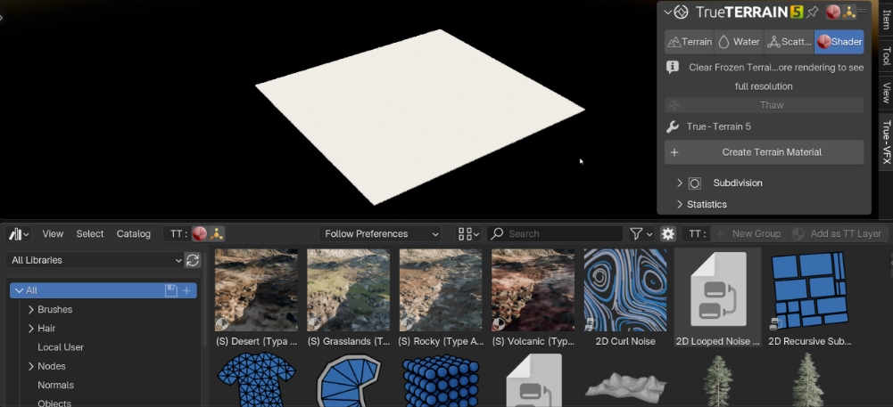 All TrueTERRAIN materials and scatter objects can be easily added into Blender's asset browser for easy access. We even have it setup for so that you can add new layers onto the TrueTERRAIN object for materials and scatter by dragging and dropping from the asset browser!